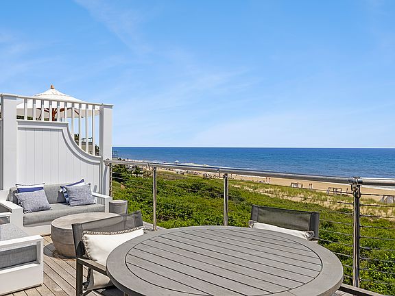 This gorgeous oceanfront unit features three bedrooms, three and one-half baths with unobstructed ocean views from nearly all rooms. The airy, light-filled living areas feature vaulted ceilings and windows flooding the space with natural light. Glass doors open wide to an oceanfront terrace showcasing dramatic panoramas of sand, sea and sky. Ideal for entertaining, the living area with a gas fireplace and comfortable seating flows seamlessly to the well-equipped kitchen providing counter seating, and high end stainless steel appliances by Viking and Sub-Zero. Downstairs the spacious primary suite has glass doors to a terrace with a hot tub and ocean views, and features a walk-in closet and luxurious bath with double vanity, frameless glass-enclosed shower with rain head and a freestanding soaking tub. A second beautifully appointed bedroom suite, has oceanside terrace access as well while the third en suite guest bedroom has sliders to a small outdoor area. This level also has a laundry/ storage room. The unit comes with private parking, and a custom beach cabana in the Hamptons most coveted location.