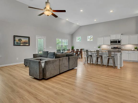 Covered porchStainless steel appliancesOpen concept livingBonus roomVaulted ceilingsLarge granite islandDining area