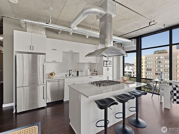 Spacious corner-unit condo at desirable Mosler Lofts! Open-concept living with floor-to-ceiling windows, an abundance of natural light and breathtaking views! Updated chef’s kitchen with stainless steel appliances, quartz island and gas cooktop. Views of the Space Needle right in your open bedroom with remodeled bathroom and walk-in closet. Catch sunset views of Puget Sound from your private balcony. In-unit washer/dryer. Amenities include huge rooftop with BBQ grills, outdoor seating and fire pit; well-equipped private fitness center, resident library loft, community lounge and business center. Secure building with concierge on site and designated parking space. Walking distance to Seattle Center, Pike Place Market and Seattle Waterfront.