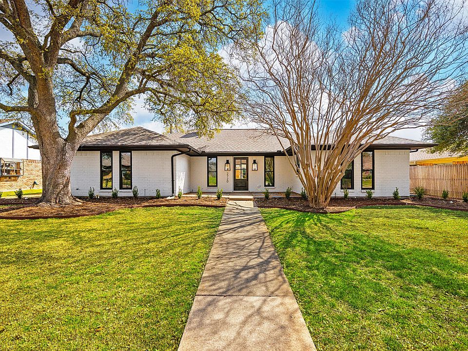 PLANO WITH A POOL UNDER $600K. Nestled beneath the graceful canopy of a stately tree & a charming crêpe myrtle, a thoughtfully designed front entryway with elegant pavers sets the stage for the warmth and sophistication found within. Meticulously reimagined by Maverick Design - vaulted ceilings, an open-concept living space, & a breathtaking statement chandelier dazzle in the natural light cascading through the skylight. A striking floor-to-ceiling brick fireplace anchors the room, creating a cozy yet refined focal point. Elegant, light-toned wood floors flow seamlessly to the covered back patio and pool and to the heart of the home. The kitchen enjoys sleek cabinetry, a stunning backsplash, and a vast island—offering seating for four—to provide both form+function. Culinary enthusiasts will delight in the 6-burner gas range, perfect for preparing meals with style and ease. Adjacent to the kitchen, the formal dining room is graced by a stunning chandelier and views of the neighborhood. Nearby, a discreetly positioned laundry room with darling tile connects to a private, chic half bath. When it’s time to unwind, the primary retreat is a sanctuary with vaulted ceilings, ample space for a reading nook, with backyard view and direct access to cozy covered patio. The en-suite bathroom is a spa-like escape with a luxurious walk-in shower, modern garden tub+double vanity with sleek modern finishes. Two secondary bedrooms with fresh carpeting share a stylish Jack and Jill bathroom with double vanity and a tub. Outside, a private oasis perfect for relaxation & entertaining awaits. The covered patio & charming pavers provide the perfect setting for outdoor gatherings, while the shimmering pool invites endless enjoyment. The versatile side yard is ideal for a dog run, play area, or dedicated sports zone. With its thoughtful design, elegant details, and unbeatable location within walking distance to school, this gem offers both comfort and style in equal measure.