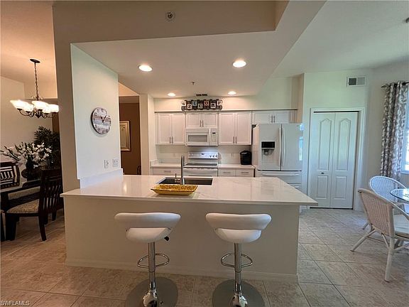 This beautifully remodeled one-year-old kitchen is a chef’s delight, featuring a lowered quartz breakfast bar that creates a perfect space for casual dining or entertaining. The eat-in kitchen boasts pristine white Shaker cabinets, accented with sleek, modern handles and soft-close mechanisms, adding a touch of elegance and convenience. Just off the kitchen, a versatile dining area can serve as a formal dining room or be transformed into a cozy den. Step out to the lanai, where you’ll enjoy breathtaking views of the 17th fairway and enjoy spectacular year-round sunsets. For added comfort, the recent addition of a screened storm door provides refreshing cross-wind ventilation during the season. Enjoy the three community pools or sip a drink at the clubhouse pool and spa. This condo has been meticulously updated, with a new AC unit, hot water tank, and a master shower that’s been re-plumbed and re-tiled, complete with a stunning glass enclosure. Once you experience the charm and functionality of this kitchen, you’ll want to call this condo home! Located in the desirable Cypress Woods, a bundled golf community, you’ll have access to a wide range of activities, including pickleball, bocce, tennis, mahjong, and bridge. Plus, enjoy a wonderful dining experience with a full-service restaurant, grill room, and outdoor patio dining.