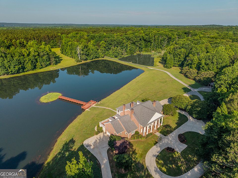 A ONCE-IN-A-GENERATION OPPORTUNITY TO ACQUIRE ONE OF GEORGIA'S MOST SIGNIFICANT PRIVATE ESTATES. Welcome to Scarlett Oaks - an extraordinary 1,028-acre legacy property representing the pinnacle of recreational southern living. A rare and irreplaceable assemblage, this iconic estate is framed by 2.4 miles of frontage on Doster Rd, one of Madison's most treasured county roads, 1.5+ miles on scenic Double Bridges Rd, and approximately 1.5 mi on beautiful and mighty Hard Labor Creek. Gated entrances on both roads, and a paved drive winding through mature trees and a creek bed to connect them, set the stage for an elegant arrival. At the heart of the property lies an 8 acre private lake and breathtaking 10,000+/- s/f estate home. Perfectly positioned to capture sweeping water views from expansive patios and wide verandas, the stately residence reflects the gracious style of a true southern estate. It features a marble-floored foyer with curved staircase, formal living and dining w/fireplaces, lakeside kitchen w/informal dining room, and a richly paneled study with built-ins and a wet bar. Nearly every rear facing room in the home opens to an expansive veranda or patio overlooking the lake, and the bedrooms feature en-suite baths and walk-in closets, ideal for a variety of future uses. The main-level primary suite is a lakeside retreat with fireplace, patio, and luxurious dressing rooms and closets. Upstairs, 5 en-suite bedrooms surround a vaulted trophy room. An additional laundry room, a discreet back staircase to the kitchen, and a Juliet balcony overlooking the circular drive round out the features on this level. On the lower level, you'll find a full guest or caretaker suite w/private kitchen and living area, a recreation room w/pool table, many storage and utility rooms, and an additional 4-car garage. An elevator connects all levels, and a full-sized attic - stubbed for expansion - offers room to grow. The estate also includes a detached office building w/kitchenette & 1/2 bath, ideal for managing land operations or working remotely. Throughout the 1,028 acres you'll find miles of trails, flowing creeks, mature hardwoods, open fields, and well-placed food plots - making it a haven for hunting, exploration, and outdoor enjoyment. Located minutes from Historic Downtown Madison and within Georgia's renowned Lake Country, Scarlett Oaks is surrounded by natural beauty, small town charm, and a thriving outdoor culture, but within a convenient radius of Athens, Atlanta, and Augusta.