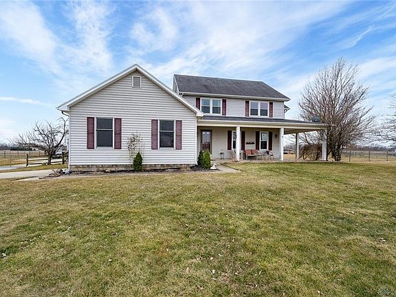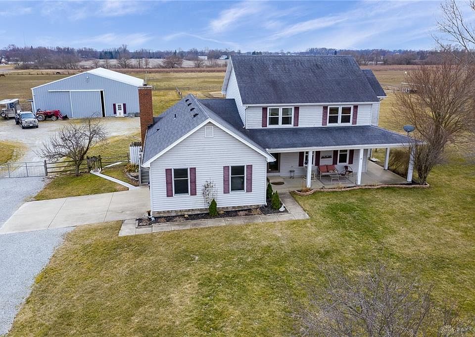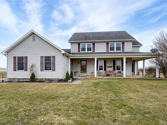 A country property on over 9 acres, ideal for any horse lover! This beautiful property offers a wrap around front porch! The dining room also has trey ceiling, bay window & access to porch. The kitchen features large island w/ cooktop, pendant lighting, stainless steel appliances, corian countertops, tile backsplash, planning desk, butler's pantry & an abundance of storage! Opening to the family room w/ woodburning fireplace and brick accent wall. Upstairs you will find the master and 3 additional bedrooms. A great rec room in the semi-finished basement w/ baseboard heat. The other part of the basement offers copious amounts of storage! Newer windows & sliding doors, water filtration system, newer AC/heat pump, Outside is a large trek deck & 54 x 60 Morton barn w/ electric & water. 5 stalls-all w/ mats (Potential 6th stall), tack room, heated washrack, large center area, office w/ baseboard heat & a loft that holds apprx 300-400 bales. Fenced pastures, paddocks & outdoor riding arena!
