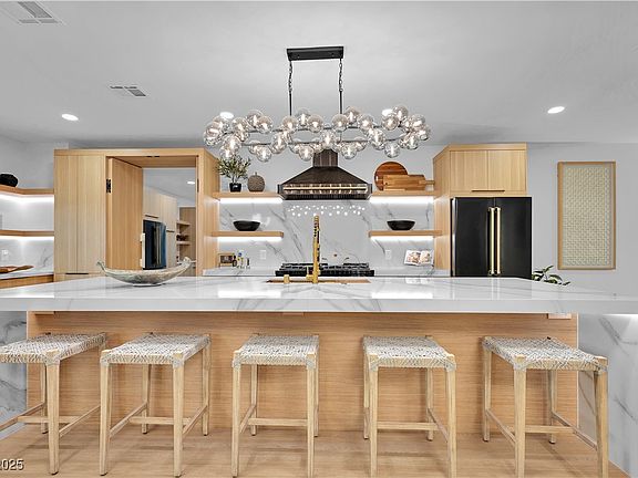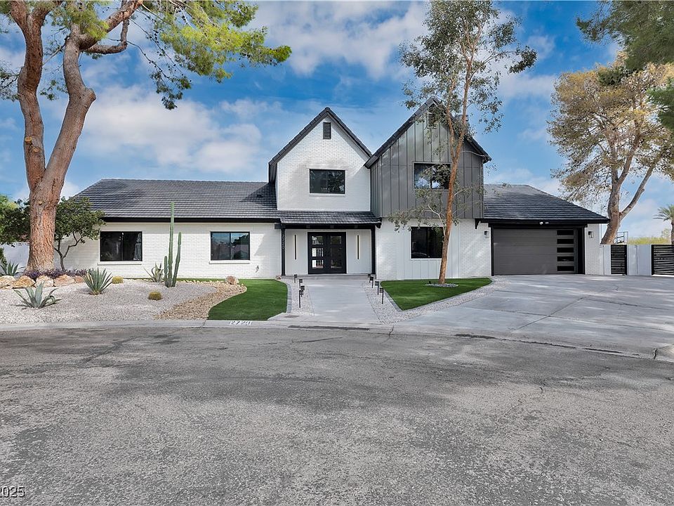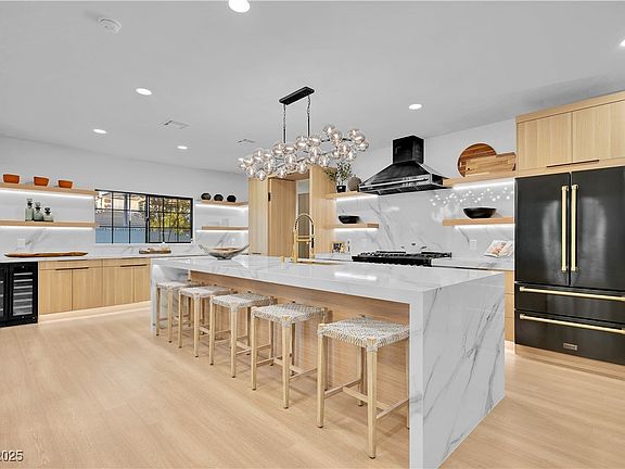 Luxury Residence in Prestigious Section 10, known for its sprawling estates, oversized lots, and timeless prestige. This fully renovated 6-bedroom, 5.5-bath luxury residence offers over 5,400 sqft of living space, including a versatile 1,100 sqft basement or next-gen suite. Highlights include a chef’s kitchen with quartz waterfall island, hidden prep kitchen with butler’s pantry, with Z-Line appliances. Expansive glass sliders open to a resort-style pool & spa, pickleball, basketball courts 4-hole mini golf, RV parking with full hookups, & lush desert landscaping. The spa-inspired primary suite boasts dual showers, freestanding soaking tub, walk-in closet, vanity, & private washer/dryer. Additional upgrades include wide-plank luxury vinyl flooring, smart home lighting, Tesla charging station, epoxy garage floors, and even a doggie spa. Set on nearly half an acre with no HOA, this estate blends modern glamour with the prestige of Section 10, just minutes from the Strip.