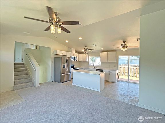 Newly remodeled split level home on double sized, fenced corner lot. Brand new home with all new systems, appliances, all new plumbing, electrical, drywall, insulation, siding & 2024 roof. Ceramic tile flooring throughout, vaulted ceilings, gas fireplace & plush carpet. Luxury kitchen featuring upgraded stainless appliances, 3cm quartz countertops with eat-in island. Dining area w/slider that leads to new deck and large backyard. Upstairs has 3 bedrooms & primary has a walk-in closet and private bath. Downstairs, family room w/sliding doors that lead to patio and backyard. Stay comfortable year round with a new heat pump with AC. Finished garage with new insulated door. Located close to the small community park, shopping, medical and more!