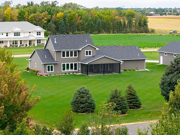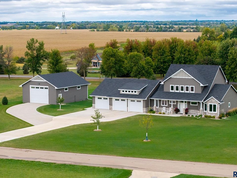 Spectacular home is ideal for anyone, including empty-nesters and families, who love serenity and beauty of the country. Located on two acres, just north of Lake Alvin, with a short drive to city conveniences with only 7 minutes to Harrisburg and 15 minutes to Sioux Falls. This 3-year-old home is in perfect condition, and better than new, with 5 bedrooms (3 on main), 3 full baths, and 3,139 square feet finished. A 28’x13’ screened patio offers another summer living area with evening views of sunsets and early-morning sunrises in comfort. There is an oversized 3-car heated garage plus a 30x40 shop that accommodates cars, RV, big toys, workshop, and lots of storage. Some features include zero-step-entry, open concept living, modern design, and much more. Easy-working kitchen with snack-island and walk-in pantry, back foyer with lockers-closets, and a separate laundry room, all with access to the garage. Gracious front foyer opens to spacious living room with a natural-gas fireplace and floor-to-ceiling windows. Main level owner's suite is complete with a walk-in closet and private bath with double sink vanity and walk-in tile shower. Upper level family room is perfect for expanded entertaining space, and has beautiful views of the backyard.