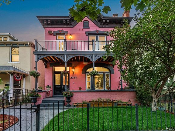 This one-of-a-kind home, situated on a quiet tree-lined street of stately Victorian homes in historic Curtis Park, lies just a few blocks from the center of RiNo. When you step into 2721 Curtis, you’ll be transported to a whimsical, Victorian era, ‘Alice in Wonderland’ atmosphere, where all its charm and character will be felt. From its original walnut staircase and wide plank pine floors to the cast-iron fireplaces, over 10-ft ceilings, and ornate woodwork, this home retains the beauty and integrity of its Victorian roots. Nearly every light fixture is a hand-selected 1800s antique, with its museum-quality railcar light fixtures as outstanding, rare pieces of history. A state-of-the-art whole house sound system, with 45 speakers throughout, offers sound control in every room. Gigabit internet. Its eight, 4k camera suite enables monitoring from a simple app. A new, state-of-the-art commercial heat pump HVAC system, with controls for each floor. Navien on-demand water heat system. With over 4300 finished sqft, the house has plenty of room to entertain, live and work. The large kitchen showcases a center island, marble countertops, farm style sinks, stainless appliances, and a huge custom pantry. The second floor features an additional library, three bedrooms and two baths. The primary suite on the second floor boasts a decorative fireplace, a relaxing balcony overlooking Curtiis Street, and a beautiiful ‘blue celeste’ Argentinian marble bath with a walk-in, rainfall shower and Rohl fixtures. The third floor features another primary suite with bath, custom top-of-the-line, mahogany Loewen windows and French doors opening to a balcony with stunning mountain and city skyline views. The basement features original stone walls, antique arched doors, reclaimed wood floors, and a granite bar top imported from Madagascar. Home theater with custom, app-controlled lighting and immersive 13-speaker surround sound movie theater with a 72-in TV and tech rack included in sale.