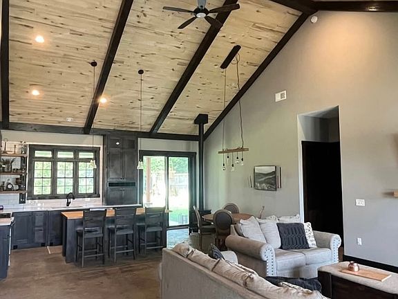 Features a walk in closet in primary room, lots of natural lighting, a stove fireplace, quartz countertops in kitchen and a butcher block island, unique concrete stamped floors, custom cabinetry and doors throughout.