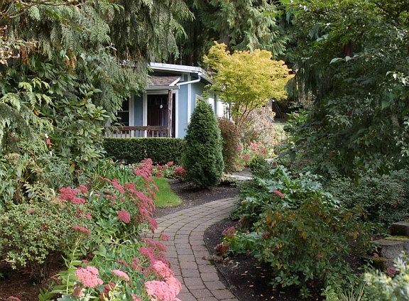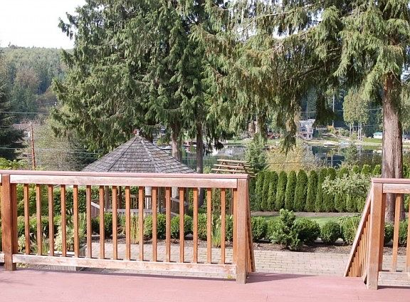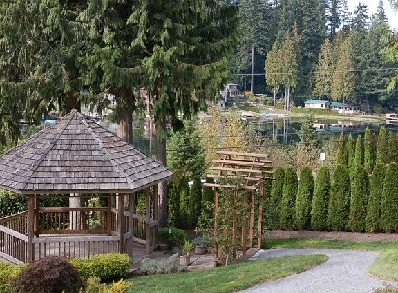 Amazing setting for this home! Take time to stroll the grounds and admire the beauty of this private garden complex with a fire pit and picnic table, a huge front deck looking out at the lake and a private gazebo! This home is pristine and features a cozy wood stove in the living room, separate dining room and laundry room/mud room. Master suite has His/Hers walk in closets and French doors opening to the master bath! Shop has underground power, RV parking galore! Private office/Guest cabin!