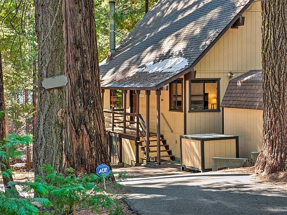 Great cabin on a level lot in Big Trees Village. Large great room with high wood vaulted ceilings. Updated appliances in the kitchen. 2 bedrooms with 1 full bath on the main level. Upstairs is a loft area with another large bedroom with a full bath attached. There is a large expansion area on the ground floor where the laundry is currently. You could turn this into a recreation room or extra bedroom.