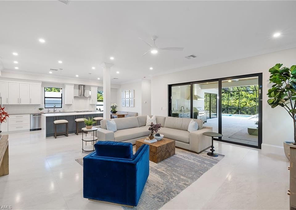 Fabulous new Construction in Bayshore District offering luxury, functionality & the coveted Naples coastal lifestyle! Step into a world of refined craftsmanship and modern sophistication with this brand-new, custom-built residence located in Naples’ dynamic Bayshore District—a neighborhood alive with art, live music, and waterfront dining. This stunning furnished, 4-bedroom plus den, two-story home perfectly balances elegant design and functional living. Inside, expansive open-concept spaces flow effortlessly between the living, dining, and gourmet kitchen areas, all curated with high-end finishes and contemporary architectural details. Every room is bathed in natural light, highlighting the home’s clean lines and sophisticated palette. The first-floor primary en-suite offers a serene retreat with luxurious finishes and spa-like bath, while the den and an additional bedroom on the same level provide flexibility for guests or a home office. Upstairs, a private enclave awaits—two guest bedrooms and a spacious open lounge area with a wet bar, ideal for multi-generational living or visiting family. For added privacy, the stairway is set behind a locking door, creating a secluded second-level retreat - which could also serve as an income source if rented out. Outside you will find your own personal oasis, with a resort-style pool, outdoor kitchen area with grill and covered dining/entertaining space, designed for year-round enjoyment under the Florida sun. A two-car garage provides ample storage and convenience, complementing the home’s modern functionality. Just minutes from downtown Naples and Fifth Ave with it's renowned dining and shopping areas and moments from the artistic energy of Bayshore, this home offers the ultimate blend of luxury, lifestyle, and location—where contemporary design meets coastal charm in one of Naples’ most exciting and evolving districts.