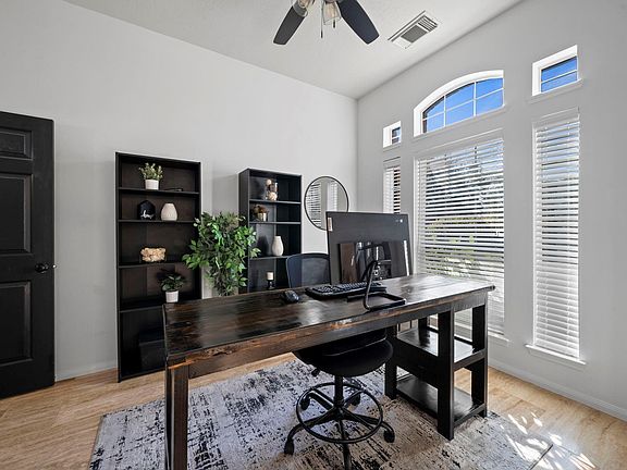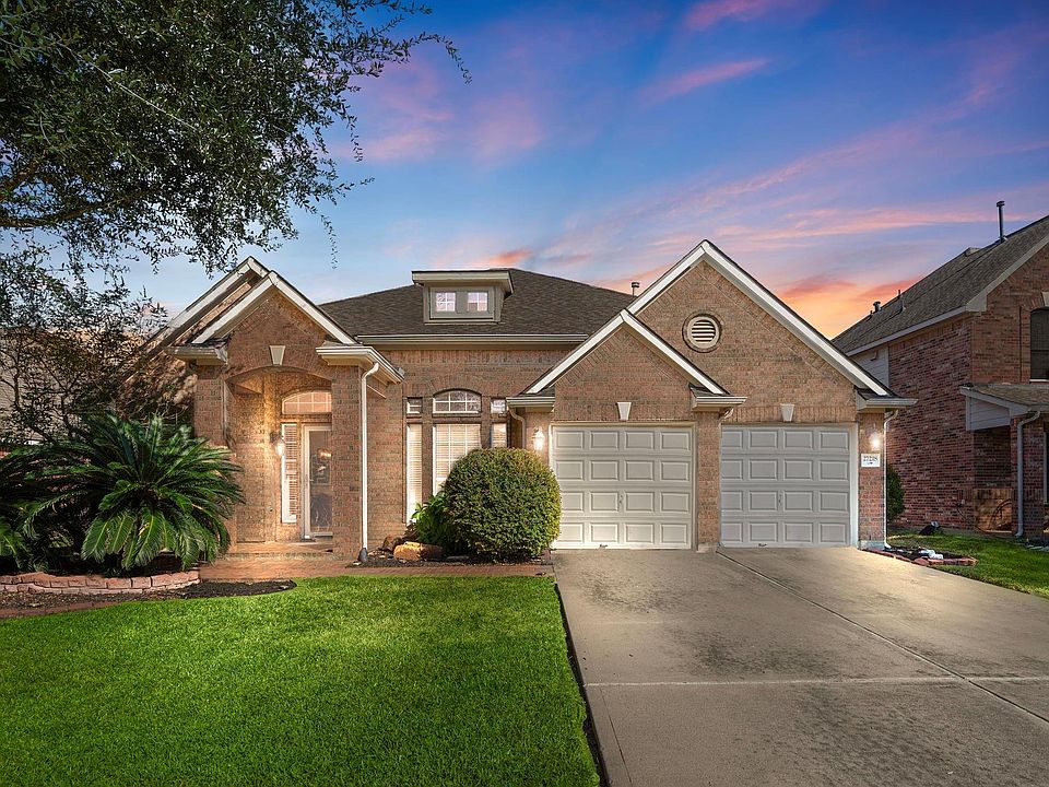 Welcome to this elegant 1.5-story home in sought-after Blackhorse Ranch South, just minutes from BlackHorse Golf Club. The front of the home features a private office with French doors, formal living/sitting area, and formal dining room. Toward the back, enjoy an open kitchen, breakfast nook, and family room with a brick-accented fireplace and backyard views. The primary suite is on the left wing with dual vanities, soaking tub, and walk-in shower; bedrooms 2 & 3 and a guest bath are on the right. Upstairs offers a spacious media/game room with full bath. Outside, relax under the pergola and string lights on the brick patio. Enjoy worry-free living with a 3-year-old roof, a whole-house generator and new HVAC (installed Jan 2025). Zoned to top-rated CFISD schools and move-in ready!
