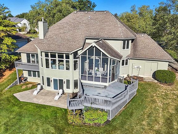 This award-winning Parade Home is located in the highly desirable Autumn Ridge neighborhood, offering convenience to NACS schools, shopping, recreational activities, and I-69. The community features two association pools, tennis/pickleball courts, and direct access to Autumn Ridge Golf Club. From the elevated screened-in porch and deck, enjoy breathtaking sunrises over the 15th tee box, or look south for serene views of the pond and treeline. Inside, the Great Room impresses with a two-story wall of windows featuring power-controlled blinds, a gas fireplace with oversized mantle, and abundant natural light. The spacious kitchen is equipped with double wall ovens, granite countertops, and a versatile island perfect for gatherings. The main-level primary suite offers a private balcony, while upstairs you’ll find three bedrooms—one with a loft. The walkout basement expands your living space with a pool table, wet bar, den, 5th bedroom, and full bath—ideal for entertaining or relaxing. A portion of the home sale proceeds will be donated to the local breast cancer fund.