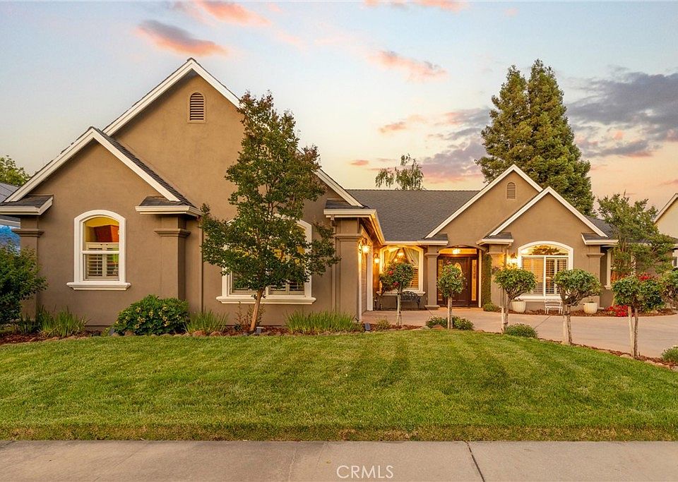 Step into this exquisite Tuscan-inspired sanctuary where timeless design meets contemporary comfort. This beautifully crafted 4-bedroom, 3-bath home spans over 2,500 sq ft of elegant living space. From the grand entry with soaring ceilings to the fine crown molding and plantation shutters in every room—including the garage—no detail has been overlooked. Enjoy the energy efficiency of solar power, keeping you cool in summer and cozy in winter. The formal dining room is perfect for hosting special occasions, while a cozy breakfast nook beneath a lighted dome ceiling offers a serene start to your day. The gourmet kitchen boasts upgraded cherry wood cabinetry, quartz countertops, a walk-in pantry, Italian medallion backsplash, custom stone range hood, gas stove, and premium stainless appliances. The spacious family room with a gas fireplace flows effortlessly into the private backyard oasis—lushly landscaped with mature trees and a manicured lawn. The primary suite features a fireplace, spa-style jetted tub, walk-in shower, dual vanity, and direct access to a covered patio with skylight. Two guest rooms feature en-suite baths, and the fourth bedroom—perfect as an office or den—overlooks the pristine front yard. Upgraded lighting, ceiling fans, and thoughtful design enhance every room. Located near PV High, Marigold Elementary, parks, and premier shopping. This home is a rare blend of luxury, charm, and enduring quality.