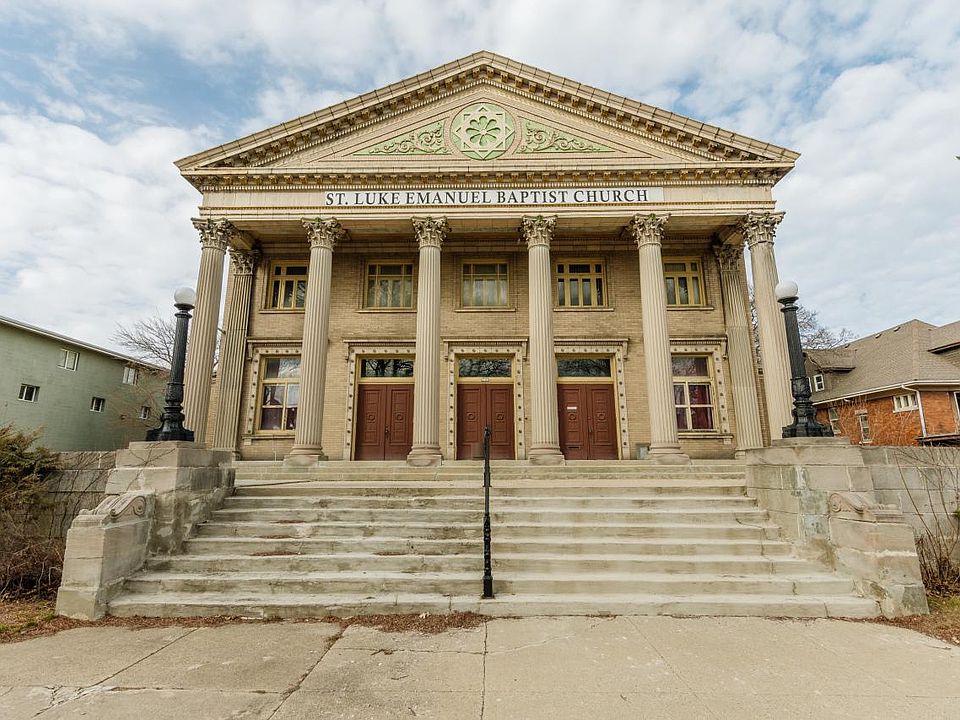 Welcome to this stunning church, one of a kind opportunity, St. Luke's Emmanuel Baptist Church. ''It is significant as one of the few examples of Neoclassical church architecture in Milwaukee. Extant Neoclassical building in Milwaukee are essentially the product of early 20th century design & rely heavily on Roman prototypes. It is a Pantheonic structure w a two-story portico and a copper lantern-topped dome. The building is centrally planned w an elongated portico on the south elevation. Ornament is limited to the six, fluted, limestone Corinthian columns, the glazed terra cotta ornament in the tympanum of the pediment and the enriched jambs of the entrances. Terra cotta cornices serve as the only decoration on the main body of the church and complement the tan face brick used throughout'
