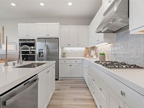 Referred to as "Element Plan 1" this single-level condominium on the second floor of the building has Quartz kitchen counter tops, built in "soft-close" cabinets in kitchen & hallway, Samsung kitchen appliances, Navien tankless water heater, Ring security camera/doorbell, Schlage keyless entry, Honeywell thermostat for programmable a/c and heating. Has a large covered balcony, private storage locker in the communal hallway, and a detached 1-car garage with an EV charging system. Building has a security call box for authorized access. Location is high above Santa Clarita valley, with access to community's 3 resort-style pools and outdoor spa, and just minutes from 5 freeway and formidable retail. and some of the highest rated schools in the sate. This unit has been upgraded throughout to include FREE premium flooring worth over $10,000 (retail pricing) which will include luxury vinyl plank in the main living space, luxury carpet in the bedroom and hallway and 12" x 24" ceramic tile in the bathroom.