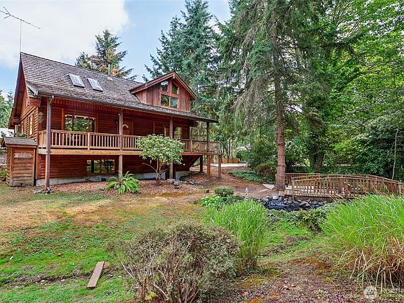 Escape to a rare sanctuary on a spectacular 13,939 sq ft lot. This unique three-level PNW log-style home blends rustic charm and modern living, featuring vaulted ceilings, skylights, and windows that flood the space with light. The 2,958 sq ft layout includes 3 bedrooms, 1.75 baths, a loft, and two bonus rooms—perfect for a home office, media room, or a gym. The walk-out basement adds versatility. Outside, the landscaped grounds are a masterpiece with a seasonal stream, pond, gazebo, and fruit trees. A greenhouse and shed are ideal for the avid gardener. Relax and entertain on the generous deck. Enjoy easy access to I-5 & I-405 and the top-rated Northshore School District. Don't miss this one-of-a-kind log home.