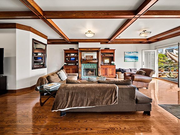 Enter through the courtyard garden on the canal and step into an inviting open floor plan bathed in natural light. French doors frame water views & effortlessly merge indoor and outdoor living. Rich hardwood floors and a vintage tile fireplace anchor the living space, creating a warm, elegant ambiance. The open dining area makes the space ideal for hosting gatherings. An entertainment gallery and European chef's kitchen with hand made cabinetry, custom countertops and a vintage stove flank the main living area. Off the kitchen is a spacious private garage with additional driveway parking, a rare find so close to the beach. Upstairs the expansive primary suite is a true sanctuary with exposed beams, vaulted ceilings and a generous walk-in closet.