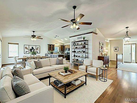 Curb appeal and beautiful landscaping set the stage for this 3-bedroom, 3-bath ranch with a full basement in Maryville. Step inside to an inviting open floor plan with vaulted ceilings, hardwood floors, and two fireplaces. The kitchen features a peninsula island, plentiful cabinetry, and upgraded GE appliances. A separate laundry room and oversized 2-car garage provide everyday convenience. The spacious primary suite offers comfort and privacy, while the mostly finished basement expands your living space with a large family room, bonus room, and a luxury full bath with soaking tub. An additional partially finished space is ideal for storage, fitness, or hobbies.