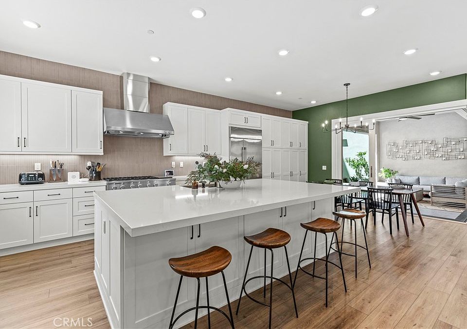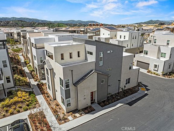 Welcome to this 5BR Valencia Home in Five Points is a STEAL! This stunning 5-bedroom, 4.5-bathroom residence offers 3,377 sq ft of thoughtfully designed living space, situated on a premium corner lot featuring an expansive balcony. Step inside to discover luxury vinyl plank flooring spanning the main level and a spacious open-concept layout. The gourmet features Quartz countertops, custom counter to ceiling tiled backsplash, GE Monogram and GE Profile stainless steel appliances, updated hardware, and a large center island. Custom interior paint and designer wallpaper accents add warmth and style throughout the home. The first-floor bedroom with an adjacent full bath is perfect for guests or a private home office. In addition to the first floor, a stylish, custom-designed mudroom was created featuring a built-in bench, a dedicated shoe storage area, and a spacious coat cabinet. Also, under-stairs storage is a custom-built, open shelving unit. The primary bedroom features a spacious walk-in closet, thoughtfully designed with upgraded shelving and organizational drawers to maximize functionality and style. An additional second closet with shelving adds storage options. Spa-like en-suite bathroom featuring a remodeled shower, dual sinks, custom mirrors, and designer fixtures. Three additional bedrooms, each with ceiling fans and plush carpeting, plus laundry room with added upper cabinetry, complete the second level. The third-floor loft features luxury vinyl plank flooring throughout, combining style and durability for a refined living space and endless possibilities—home office, gym, playroom, or movie lounge—plus access to an outdoor deck. Enjoy seamless indoor-outdoor living with a floor-to-ceiling sliding door that opens to a fully landscaped, low-maintenance backyard. Complete with synthetic turf, a built-in 36” BBQ, Malibu lighting, and countless designer details, this backyard is an entertainer’s paradise. Additional features include a direct-access garage with extra storage space (perfect for a home gym), energy-efficient solar panels, and a whole house water filtration system. Located just minutes from Six Flags Magic Mountain, shopping, dining, and within the boundaries of top-rated schools. Residents also enjoy FivePoint Valencia’s resort-style amenities, including pools, playgrounds, clubhouse, community garden, and a weekly Sunday Farmers Market. This home truly has it all—luxury, location, and lifestyle!
