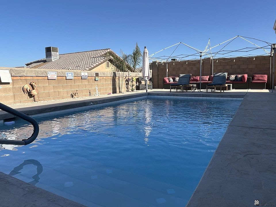 This stunning newer home sitting near the golf course features 4 bedrooms and 2 bathrooms, including a generously sized primary bedroom. The open floor plan highlights a large kitchen with a spacious pantry and upgraded details such as the storm door as you enter, 6' living room fan, two gorgeous crystal chandelier fans with one in the dining area and one in a bedroom, a farmhouse sink, and a lighted hanging pot rack for your convenience .Outdoors enjoy multiple covered patio areas for BBQs and entertaining, a deep-end salt water pool with two 10' expanding umbrellas, RV parking adjacent to a 200 sq ft workshop & 3 citrus & 2 olive dwarf trees.The home also boats a whole house reverse osmosis water filtration system located in the garage with added bright LED lighting and a fan & for added security a 6 camera system is included.This home offers the perfect mix of modern upgrades, comfort, and a prime location near everything.