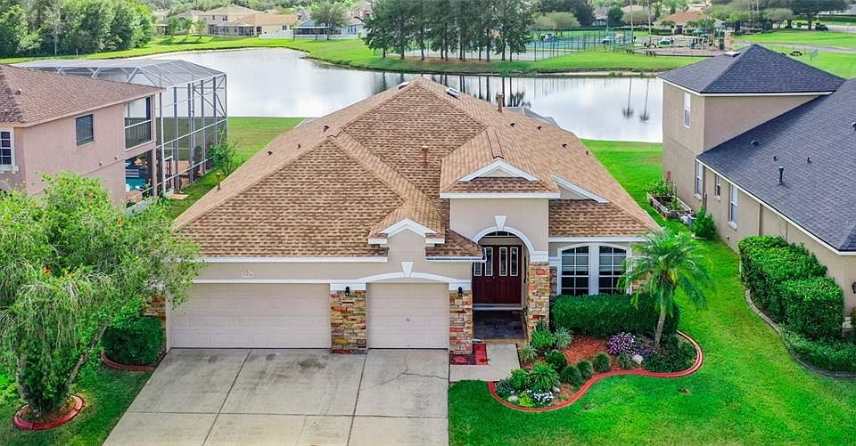*PRICE CHANGE* Fabulous 4/3/3 POOL HOME in an AMAZING LOCATION! Relax in your heated pool and spa while looking out at the beautiful POND VIEW! Added bonus: You are nearby the community amenities located beyond the pond, including a pool, playground, tennis, and basketball courts...close enough to enjoy but far enough to preserve the peacefulness of your property. This home boasts a split floor plan with family room plus living/dining room. Flex room can be used as a playroom, den, office space, etc. The kitchen looks out to the family room, leading to the screened-in patio/pool area. All of that, plus a gas fireplace and built-in speaker system makes this house perfect for entertaining! For practicality, there is an inside laundry room with wash basin, plus the 3-car garage features a built-in work bench. New interior paint, ROOF and WATER HEATER 2022, pool pump, heater, and screens 2021, tile 2019/2020, kitchen appliances 2019, exterior paint 2016, A/C 2015, plus other upgrades. Commuting? This home is only a short drive to I-75! Only 0.4 miles to the nearby elementary school, just over 4 miles to Tampa Premium Outlets & Popstroke, and 1.6 miles to the Grove (shopping, restaurants, the KRATE, mini golf, B&B theatres), and more!