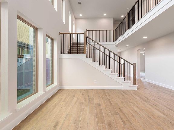 Home office with French doors frames entry. Open floor concept features a dining area with 19-foot ceiling just off the kitchen and family room. Island kitchen with built-in seating space and a corner walk-in pantry. Spacious family room with 19-foot ceiling, wood mantel fireplace and a wall of windows. Secluded primary suite offers a front yard view. Primary bath features dual vanities, linen closet, garden tub, separate glass enclosed shower and a large walk-in closet. Second level boasts a large game room and secondary bedrooms including a guest suite with a full bathroom, walk-in closet and access to a linen closet. Utility room and mud room just off the rear two-car garage. Covered backyard patio.