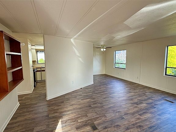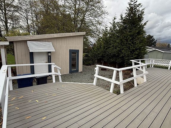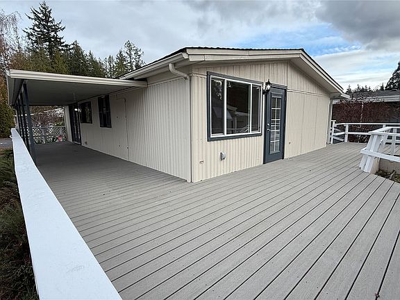 Enjoy one of the best lots in Park Village, with a private wraparound Trex deck overlooking a 5-acre greenbelt and seasonal creek. The home features new laminate flooring throughout the living spaces, carpeted bedrooms, and a kitchen with new stainless steel appliances and quality cabinets. The primary bedroom opens to the deck and includes a full bath with walk-in shower. The guest bedroom also opens to the deck and backyard. Additional highlights include a custom greenhouse, large workshop, PEX plumbing, and covered parking. Park Village is a gated 55+ community with green spaces, clubhouse, on-site RV parking, and a friendly atmosphere.