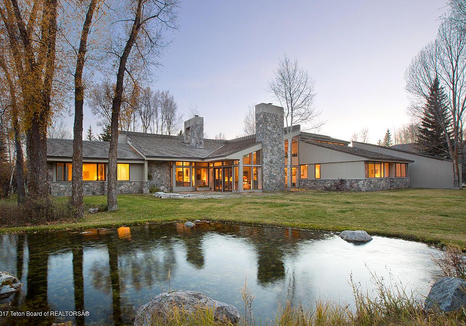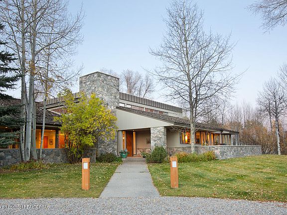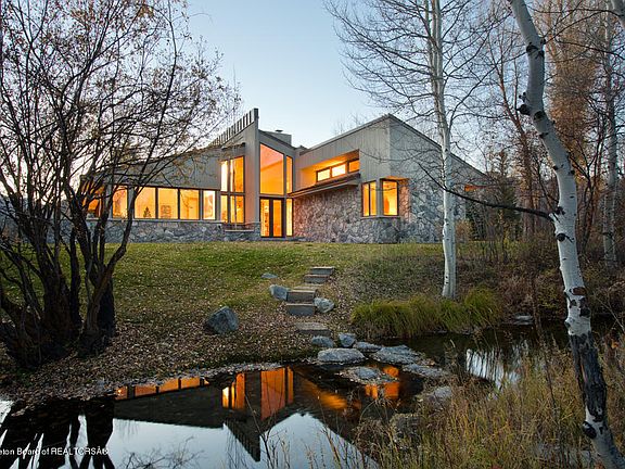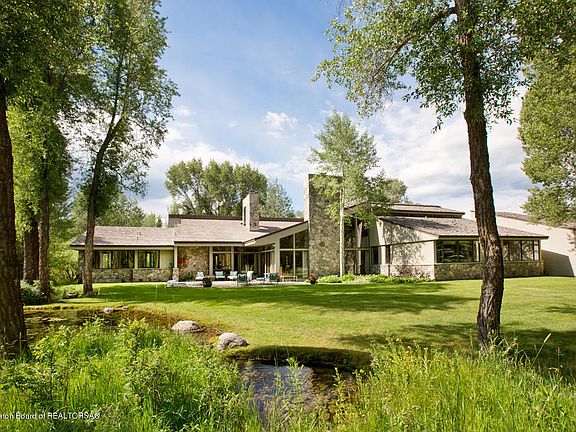 Well ahead of its time when built, this mountain modern design is a perfect home for today. Situated on 3.55 acres in John Dodge Subdivision, the 6,740 square feet of living space includes 3 bedrooms, 3.5 baths, and a separate one bedroom / one bath guest or caretaker apartment. The custom home was designed by Max Smith of Salt Lake City and built by Shaw Construction for the current and only owners. The private setting is unmatched with a beautiful stream that flows year round, filtered mountain views, a dedicated easement to the Snake River, and close proximity to Jackson Hole Mountain Resort and numerous other amenities.