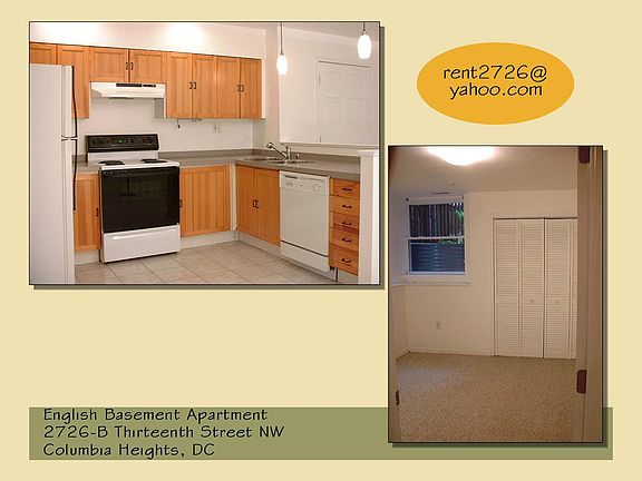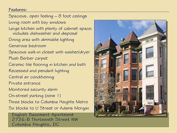 Spacious and bright English basement apartment for rent in Columbia Heights, at 13th and Girard. Easy walking distance to green line/yellow line Metro or bus lines, plus walk to hip restaurants & bars, Target, Washington Sports Club, Giant/Harris Teeter/ Trader Joe's, U Street, Adams Morgan, even the zoo. Quiet and friendly neighbors on all sides. AVAILABLE NOW MOVE-IN SPECIAL: $500 OFF DECEMBER RENT! * Private secure entrance * Spacious, open feeling -- uninterrupted 8-foot ceilings * Living room with bay windows * Large kitchen with plenty of cabinet space; includes dishwasher and disposal * Dining area with dimmable lighting * Generous bedroom * Spacious walk-in closet with washer/dryer * Plush Berber carpet * Ceramic tile flooring in kitchen and bath * Recessed and pendant lighting * Central air conditioning & electric heat * Monitored security alarm * Store a bike securely in entry vestibule with locked gate * Walk Score 89: "Very Walkable" and "Excellent Transit" * Eight minute walk to Columbia Heights Metro on green and yellow lines * Eleven minute walk to U Street or 15 minutes to Adams Morgan * Commute downtown: 6 min. by car, 10 min. by bike, 19 min. by transit * Car sharing nearby: Zipcar, RelayRides, Hertz On Demand * Three Capital Bikeshare stations nearby * On-street parking (zone 1) Twelve-month lease. Water, alarm monitoring, and yardcare paid by owners; all other utilities (electric, phone, cable) by tenant. References and background/credit check required per applicant. First month's rent plus security deposit due at signing. Please no smoking, no pets, and no sublease. Thanks!