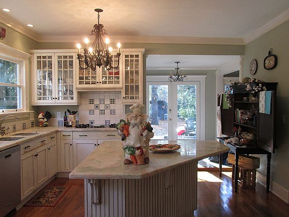 You'll find yourself rushing to come home to this charming 4 bed and 2.5 bath home on The Hill. The lush landscaping and large covered porch provide a peaceful sitting area for you and your guests. The interior offers even more, beautiful hardwood floors throughout, living room with gas log fireplace, dining room with French doors, large kitchen with a built in workstation, marble countertops, and sizable island with seating. The owner's suite is on the main level with claw foot tub and separate shower. Another room on the main floor could be used as an office, den, or additional bedroom. The upstairs has two more spacious bedrooms, a bonus room, and full bath. Plenty of space in the manicured backyard that includes a shed and covered seating area. This home also has a unique 'round the back' driveway' that provides convenience while maintaining the beauty of the landscaping. The fine details throughout this home are sure to catch your eye.