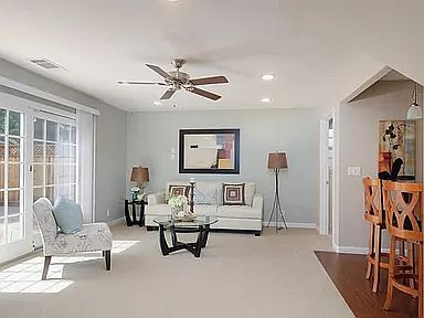 In Midtown on a peaceful street near Palo Alto Schools, this bright, beautiful, large two story home has many updates including skylights. The Master bedroom and an attached large bonus room are upstairs, with a coffered ceiling with crown molding, features a spa-like bath with jetted tub, separate shower & dual sink vanity with granite slab counter. This large bonus room has its own closet and can be used as a fourth bedroom or work office. Downstairs features two large bright bedrooms and one and half baths. A bright and high ceiling living/dining great room with hardwood floor , and a separate family room with wet bar. Large kitchen has abundant cabinetry, stainless appliances including a 5-burner gas range & double ovens, skylight & hardwood