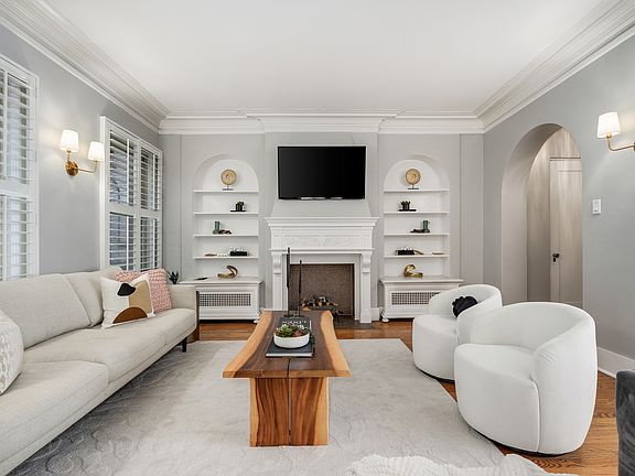 Decorative fireplaceSleek updatesLarge bedroomsOriginal crown moldingIn-unit laundryOpen shelvingCustom cabinetry