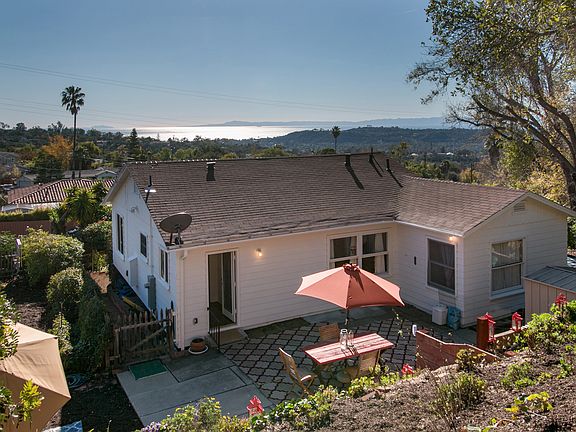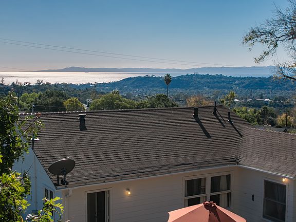 EXPANSIVE OCEAN & ISLAND VIEWS. Bright and sunny, pristine California home located in Mission Canyon area. Large picture windows showcase the breathtaking ocean and island views, and beautifully updated and modernized for comfort and convenience, this home retains the many original 1940's charming features, including a studded front door, gleaming wood floors, ceiling molding, new subway tile for a retro feel in the bathroom, sparkling white tiled kitchen with lots of cupboard space and stainless appliances, three beautifully decorated bedrooms, and a separate laundry room. There is a lovely indoor-outdoor ambience, taking advantage of the large yard and paved patios for relaxation and fun. The garden provides a wide variety of fruit trees, including grapefruit, passion fruit, lime and loquat, and wonder ocean and island views from the top of the terrace. Surrounded by mature shade trees and new landscaping, the home offers tremendous potential for expansion to take advantage of the very large lot and serene location. Two car garage. Sought-after Roosevelt school district.