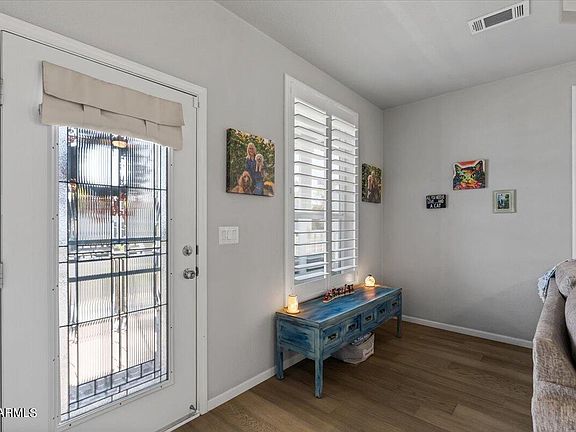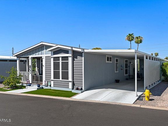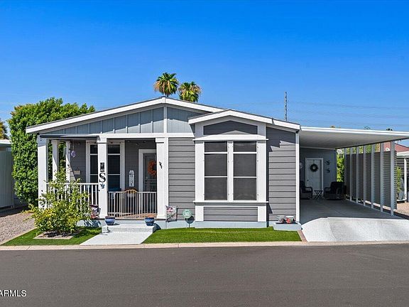 Welcome to your new home in a vibrant 55+ active adult community! Beautiful engineered hard wood floors throughout, 7' Kitchen Island, walk in pantry with custom glass door, quartz countertops, reverse osmosis system, farmhouse sink, ceiling fans, tray ceilings and shutters throughout. No details have been missed! When it comes to outdoor living, you're in for a treat. Covered front porch with roll down patio shades and privacy gate, lush landscaping that provides great privacy and shade, privacy metal wall, buried dog fencing, concrete coating on the carport, oversized large storage shed, sun screens, security door, water softener and turf for low maintenance landscaping. This community has a community pool, a fitness center, a community center, and a dog park along with bike trails everywhere. Fantastic location near the Cubs Spring Training Stadium and Riverview entertainment district. 10 minutes from Phoenix Sky Harbor ariport, 30 minutes from Mesa Gateway Airport, 15 minutes from downtown Scottsdale, 90 minutes from Prescott, 3 hours from Showlow, 2 ½ hours from snow skiing and snowboarding in Flagstaff, 4 hours from the Grand Canyon. Financing options are available for this manufactured home, subject to buyer qualification. Come see for yourself and imagine the possibilities!