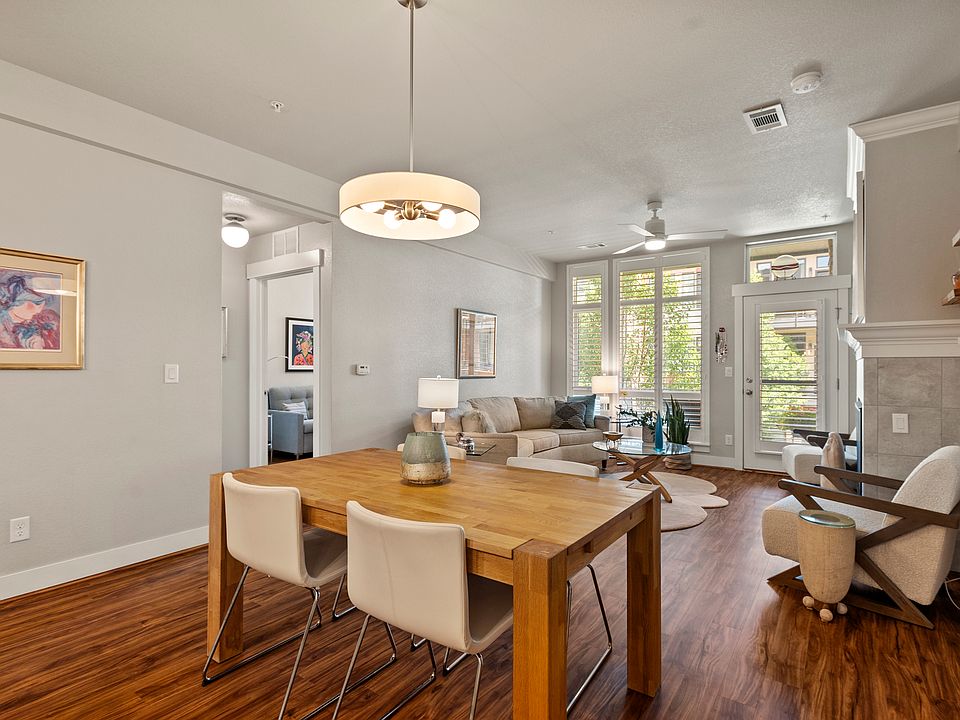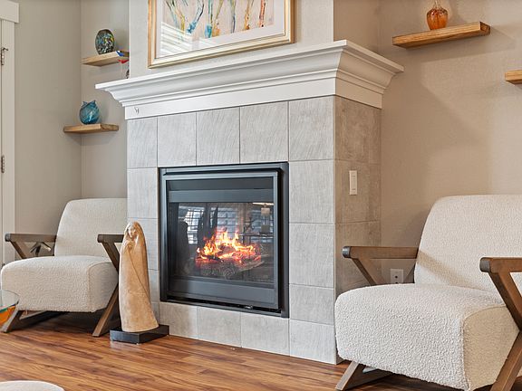 Gas fireplaceLarge primary suiteBalcony overlooking green spaceStainless steel appliancesPrivate bathroomWalk-in closetLarge kitchen island