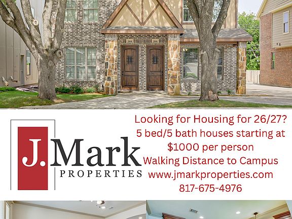 This newly constructed 5 Bedroom, 5 Bath duplex is about a 7 minute walk from the TCU campus. Features include stainless steel appliances in the kitchen, granite countertops, hardwood type flooring throughout the entire house. Washer and dryer included, in unit. 4 offstreet parking spaces. Full security system.