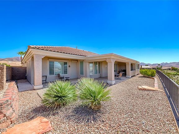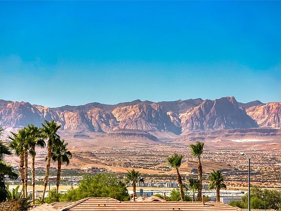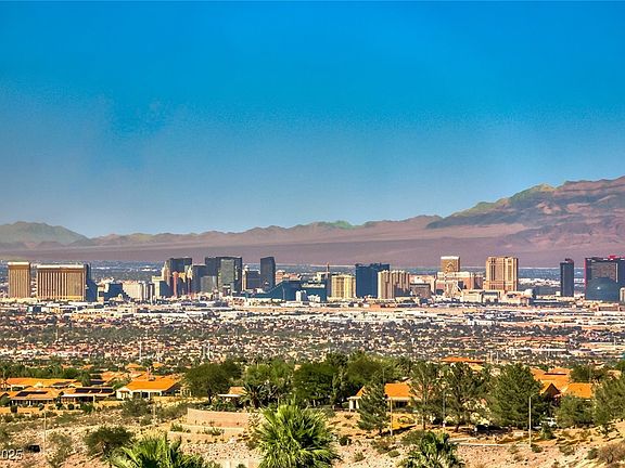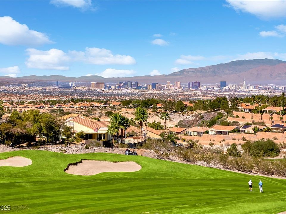Expanded Anthem model with breathtaking views of the entire Las Vegas Strip, golf course, and mountains. Perched high above the 18 hole of the Concord golf course, this premium view property offers two separate entrances perfect for multigenerational or NextGen living. A grand entry leads to a formal living room with dramatic curved windows, tile flooring, and wet bar ideal for entertaining. The chef’s kitchen features granite counters, large island, stainless appliances, and opens to the family room. The spacious primary suite includes sitting area and spa-like bath with dual vanities, makeup table, and soaking tub. Upgrades include plantation shutters, electric blinds, Rolladen shutters, epoxy garage flooring, and new high efficiency Trane AC units. The low-maintenance backyard features expansive covered patio with panoramic views of the valley and city lights. Located in a Top Rated premier 55+ community with golf, tennis, pickleball, pools, and vibrant social activities.