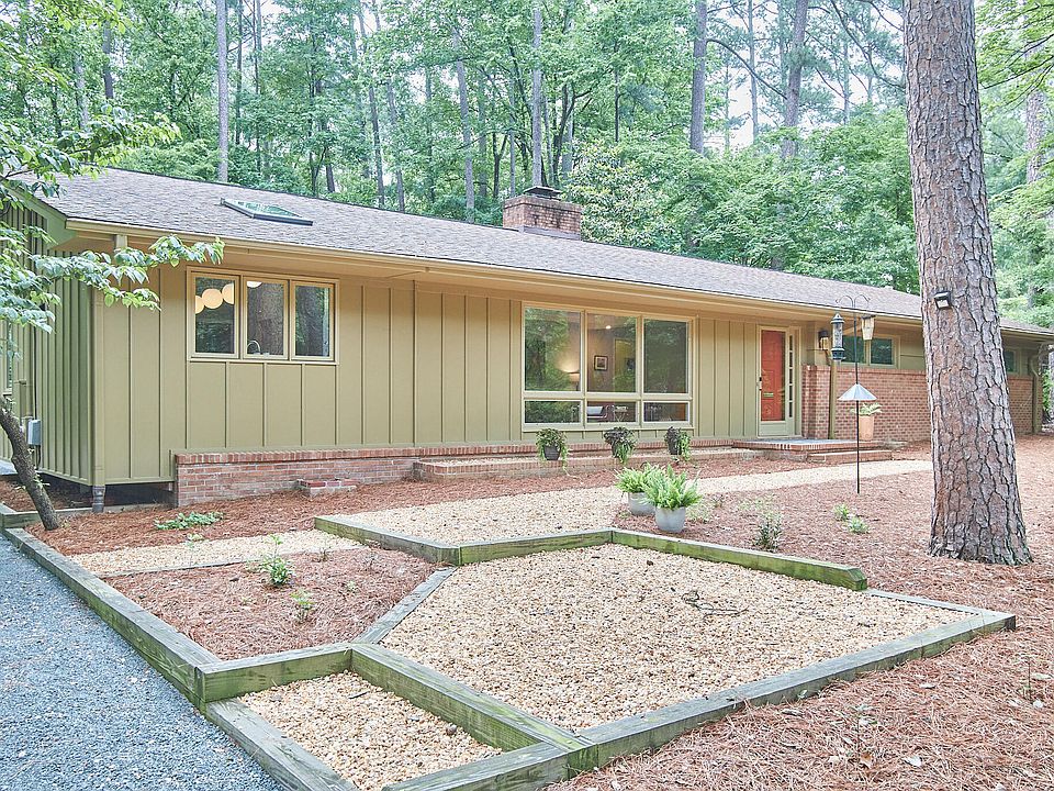 1960 knew how to build ranches, y'all, and this one is Atomic! From the inspired Coby Linton-designed kitchen with a vaulted ceiling & oodles of walnut-clad cabs plus period lighting (salvaged from a mid-century church) to the outdoor spaces that are capacious yet private and make for great entertaining on the 800+ SF deck. Four nicely sized bedrooms accommodate a robust home/work life. Two-car attached carport with storage plus a workshop are a groovy bonus. Geo-thermal heat pump (2012). Roof (2018). Roll/stroll to the Al Buehler trail in under ten minutes. Scoot over to the Lakewood area for great shopping/coffee shops/restaurants. Duke and NCCU close by.