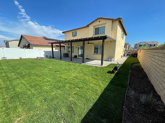 This spacious two-story floor plan offers a large Great Room which flows effortlessly into the dining and kitchen area. The kitchen includes an island with stainless steel sink, quartz counter tops, Shaker style cabinets and dishwasher. A bedroom with full bath completes the first floor. A second-story master suite features a walk-in closet, linen closet, large walk-in shower, granite dual sink vanity and an enclosed water closet. The laundry room is located off the landing near the three upstairs bedrooms and full bath. Stainless steel energy efficient appliances, tankless water heater, LED lighting. Solar Paid off. Backyard has Alumawood Patio Cover with fans and LED lighting.