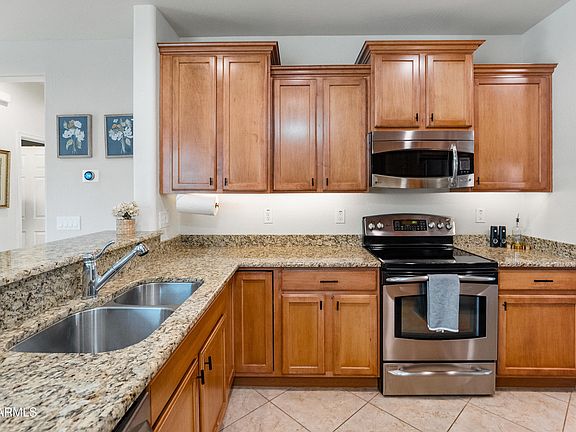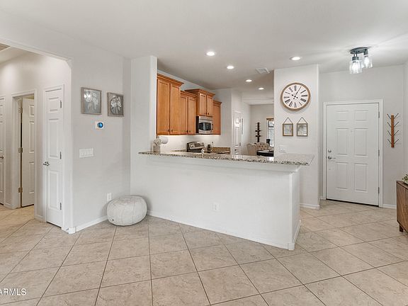 Charming 3 Bedroom, 2 Bath Spirit Model with Tuscan Stone Accents located in Sun City Festival! Immaculate inside & out, this move-in-ready home features new wood-look plank flooring in bedrooms & freshly painted interior and exterior within the past 5 years. The light-filled Great Room showcases 18'' neutral diagonal tile, while the spacious Kitchen offers granite counters, upgraded staggered cabinetry with pull-outs, breakfast bar & cozy dining nook. The large Owner's Suite includes a bay window, walk-in closet, dual sinks, glass-enclosed shower & private toilet room. Guest bedrooms share a full bath providing ideal privacy. Enjoy the tranquil backyard with mature landscaping & plenty of room to add a pool. Garage features epoxy flooring, workbench & utility sink. A true gem!