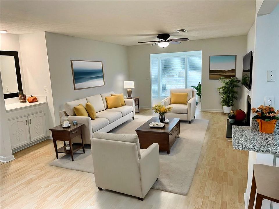 Welcome home to this 2nd story private, bright, and 1-level end-unit condo just 3 miles from the Battery! Fresh paint, updated light fixtures in every room, new flooring, new kitchen countertops, new finishes, new water heater, new HVAC! Nothing was overlooked. This spacious 2 bedroom, 2 bath home offers a master bedroom with en suite bathroom, and an open concept living space fitted with a fireplace for chilly evenings. The sunroom is a great spot to enjoy your morning coffee or unwind and relax after a long day. This friendly community features a pool, ample guest parking, and pleasant nature paths. This is the perfect location just moments from I-75/I-285, restaurants, shopping malls, great nature trails, bike paths, athletic clubs and more! Schedule your showing today!