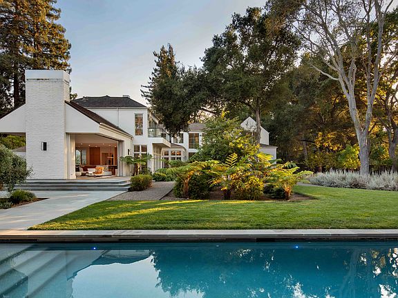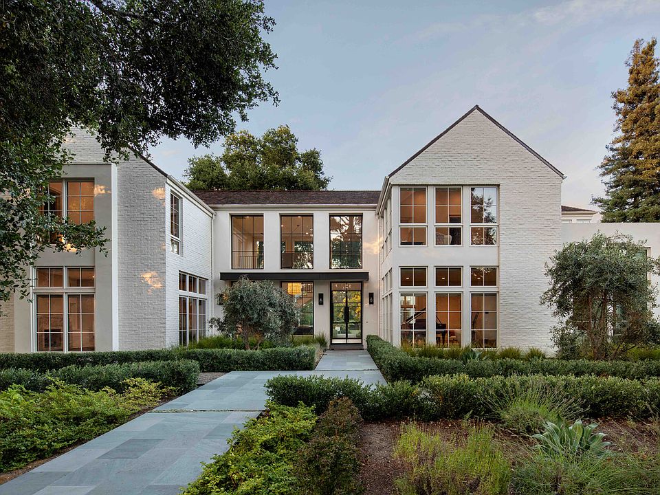 Completed in 2021, this contemporary estate pairs modern architecture with traditional reclaimed brick all in a soft white palette. Just over one acre of level grounds with two gated entrances frames the two-story home, which has 5 bedrooms, an office, and 5.5 baths, including an optional ADU with laundry and kitchenette ideal for an au pair or extended family. Beyond the formal venues, a main kitchen and professional chefs kitchen serve an open family room where disappearing glass doors create a seamless connection to the outdoors on two sides of the room. Four additional bedrooms are located upstairs, including the primary suite with sitting room and couture closet. The grounds are designed for entertaining with a pool, spa, and open-air cabana with full bath all in a secluded, beautifully landscaped setting.
