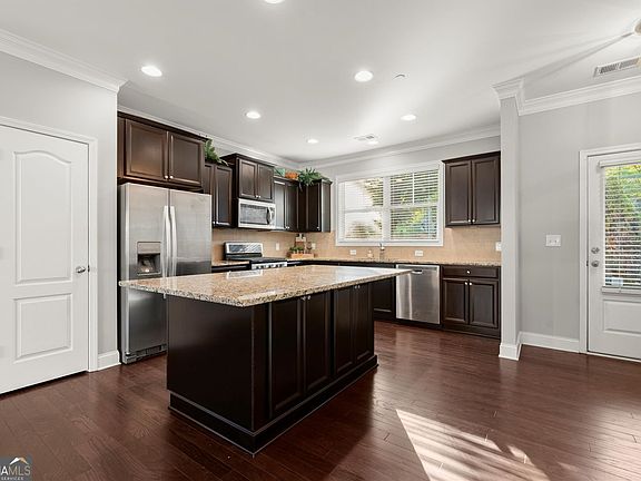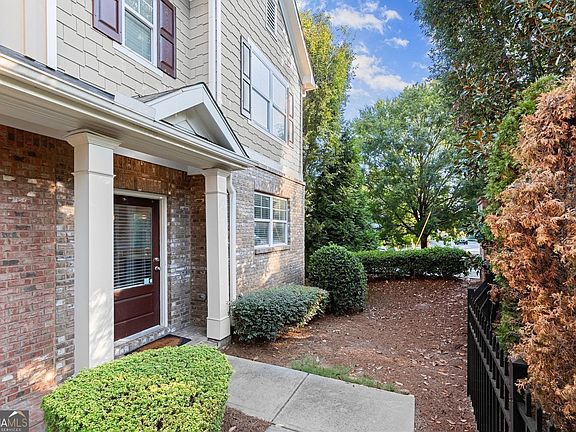 This end unit townhome is charming, updated, and offers privacy in an incredible location. The main level has a an open-concept floor plan with an executive kitchen featuring an oversized island. This all overlooks the dining area and living room, which flow to the expansive deck in the back. Upstairs, there are two, large primary suites with custom, walk-in closets and full bathrooms attached. The lower level has a full bath with a large room, easily serving as a third bedroom with a closet. This townhome is surrounded by mature trees, offering an abundance of privacy. Centrally located, you are less than five miles from shopping, dining, Truist Park, The Battery, Smyrna Village, and major highways. Welcome home!