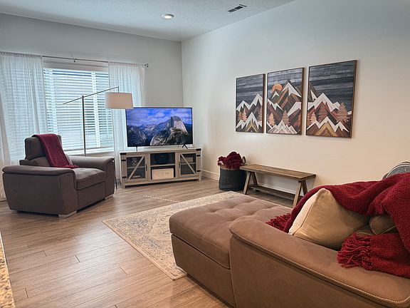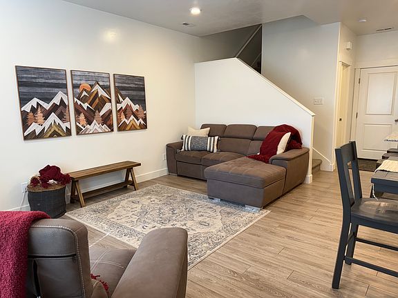 FURNISHED modern 2-story townhome in N. Ogden, 3 bed/2.5 bath/2-car garage with 2-car driveway. Stylish kitchen with granite counters, huge pantry and stainless appliances. The whole-house water softener system is brand new and offers quality water. Massive master bedroom boasts an en suite bath and a large walk-in closet. The loft area upstairs can be used as a playroom or office. Washer/dryer in unit. 24/7 Gym access, Clubhouse access, Pickle Ball Courts. Snow removal, (street and sidewalks) and landscaping included. Convenient access to hiking trails and parks.