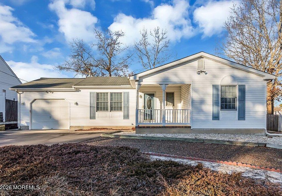 Welcome to this beautifully maintained 3-bedroom, 2-bath ranch-style home that blends classic curb appeal with a bright, functional interior. From the moment you arrive, you'll appreciate the crisp white siding, soft blue shutters, and decorative glass-inset front door. A charming covered front porch offers the perfect spot for morning coffee, while the attached garage and low-maintenance stone landscaping make everyday living a breeze.