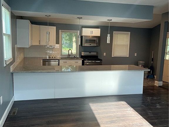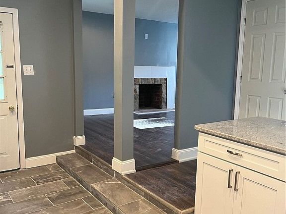 Tastefully updated two story home on a quiet street near schools and shopping with a second side lot included! Upon entering the home, an open concept dining room flows into the shiny, bright kitchen with all stainless-steel appliances, large island, soft close white cabinetry and gleaming floors. Step up to large living room with a stone fireplace great for gatherings. Upstairs, the master bedroom has a walk-in closet and an air conditioner unit that will stay. A roomy second bedroom and gorgeously updated bathroom complete the second floor. In the basement, the drywall has already been hung and plumbing installed for a possible second bathroom. A private nice sized back yard and the added second lot on the side of the house offer plenty of space for all of your outdoor needs. There is also an unpaved driveway for off street parking. Newer windows, roof, hot water tank and furnace.