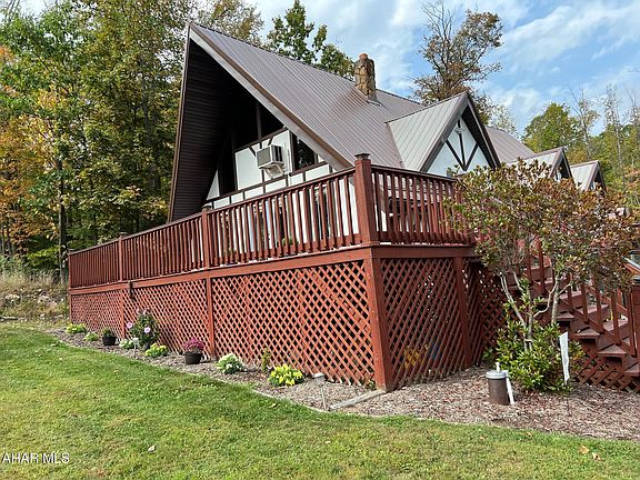 Unique A-Frame property, Updated and remodeled sitting on 5 acres of ground. Surrounded by State Game Land, borders Native brown trout stream, 10 Minutes from Spruce Creek, 30 Minutes from Raystown, 35 Minutes from Beaver Stadium (State College), 20 Minutes to Penn State Campus, Altoona. Propane Fireplaces. Great property to Entertain or have a Bed & Breakfast. No zoning, No sound ordinance. The building across from the property is a 6596 sq foot building which is also for sale on 4.08 acres.