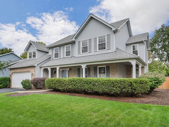 One of Oakhurst's most popular layouts is now available! Charming curb appeal with a front wrap around covered porch, a perfect gathering place to get to know your new neighbors. Hardwood flooring in the foyer continues right into the gorgeous upgraded and remodeled kitchen - Thomasville cabinetry is featured, along with a huge island equipped with bar style seating, a built in beverage fridge and tons of extra storage. Beautiful granite counters, under cabinet lighting, recessed lighting, display cabinetry, stainless vent hood, double oven and stainless steel appliances. You will never run out of storage and counter space in this chef's dream kitchen! Step down to the family room with it's brick floor to ceiling fireplace, beamed ceiling and sunny bay window. Entertain in the dining room or easily convert it into a home office, the solid wood door is already in place! Wait till you see the bedroom sizes, the room over the garage is huge and has vaulted ceiling, 2 closets and a dormered nook perfect for a desk space or reading area. The primary suite is simply beautiful with hardwood flooring, vaulted and beamed ceiling with a ceiling fan, walk in closet with a custom organizing system and a view of the back yard. The en suite bathroom boasts a massive skylight, jacuzzi tub, separate shower and a dual sink vanity. The basement is already finished and ready for fun! 2 large, open spaces can host a large group and the built in bar with mini fridge and tv area are the perfect additions, featuring recessed lighting too! There is plenty of storage space in the utility room and the crawl space. Out back you will find a beautiful newly rebuilt deck, and a fenced in yard with professional landscaping. This home is in the ultimate location! It's literally steps away from acres of parkland at the Oakhurst recreation fields, tennis courts, pickleball courts, park, clubhouse and pool, walking trails around Waubonsie Lake and the Eola Community Center. Updates include: 2023 - Resurface deck and repaved driveway. 2022 - New dishwasher, new ceiling fan in family room. 2021 - New Miseno toilet in primary bathroom, New pendant lighting in kitchen. 2019 - New Trane furnace, New water heater. 2018 - New Ge Monogram stainless cooktop, New Rheem water heater (2nd heater), New Miseno toilet in guest bath, new window shades 2016-2017 (Approx) - New carpet in LR/DR/FR/Stairs/3 bedrooms. Fresh paint throughout. Updated powder room. Remodeled upstairs guest bathroom. 2016-2017 Approx) - New Climate Guard insulated windows throughout ( with exception of kitchen windows) There's nothing to do here but enjoy!