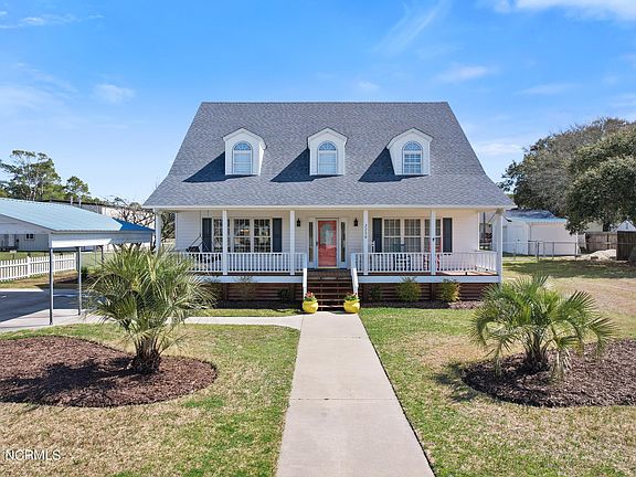 Rare find! Located in the sought after community of Hurricane Haven. Walk into the spacious living area that offers vaulted ceiling, perfect for hosting large gatherings. Both the lighting and ceiling fans throughout recently replaced, dishwasher and kitchen sink replaced within the last year. Recently added is the LVP flooring in kitchen and dining area. The large master bedroom located upstairs also has a loft that overlooks the living area. The home has 2 split heat pump systems with Wi-Fi thermostats. Enjoy quiet evenings sitting on the swing on the large 40x8 rocking chair covered front porch. Not to overlook the large, screened-in back porch. For your convenience there is maintenance free with vinyl walls and Trex-deck flooring outside shower, with both cold & hot water. The roof was replaced in 2018. The property offers two detached garages. The main garage, 26x32, is heated and cooled with a new ductless mini split system. There is additional room for guests located in this garage as it has a small apartment, 230sf, with kitchenette and toilet. The second garage, 28x31, is perfect for all your projects and is cooled with a through the wall AC system. Both buildings have water and electricity, 2 roll up doors and a walk-through entry door. There is a smaller shed that is perfect for your lawn tools and all your beach necessities. The back yard is totally fenced in, and the lawn has an irrigation system throughout the property. This home has too many features to list and is a must see! This nice size property with .80 acre is situated between Eleanor Street and Nags Head Rd with access to the waterway from both streets. Hurricane Haven allows homeowners to enjoy many amenities such as tennis courts, community pool, fishing pier and boat ramp. Located minutes from Beach, Restaurants, Shopping and Local Golf.